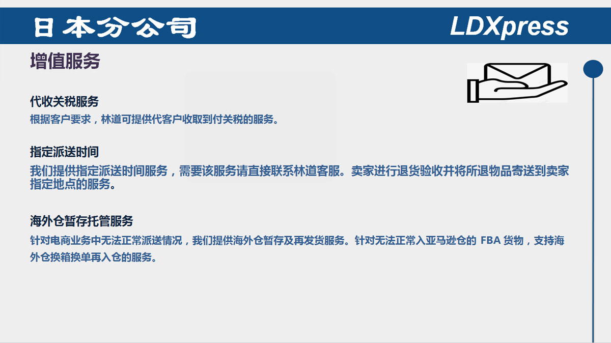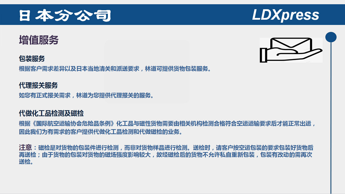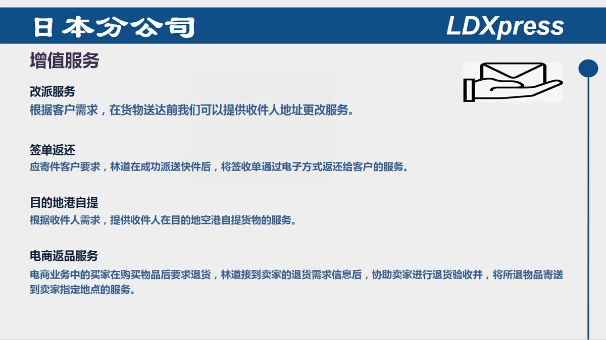 LDXpress 是國內資深專精的全球快運物流公司;我們在中國的一級城市及沿海地區貫串有系統的物流供應鏈;我們致力于打造中國民族的LDX品牌。